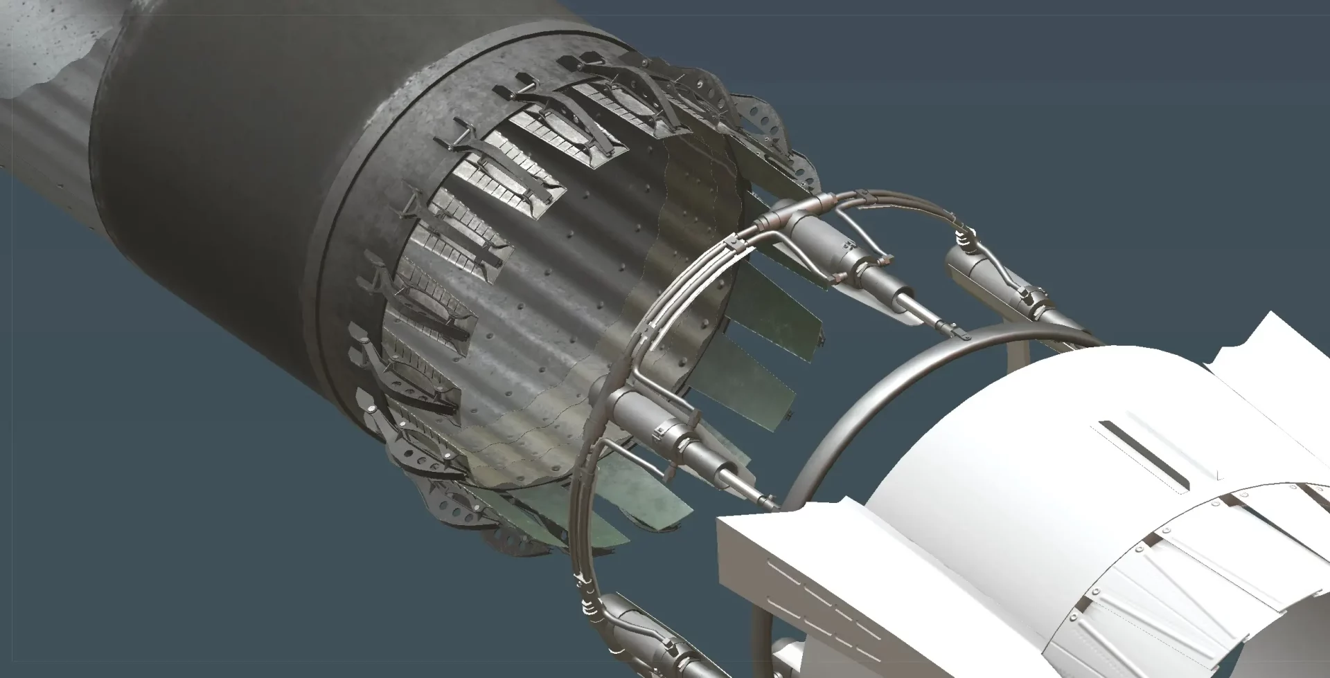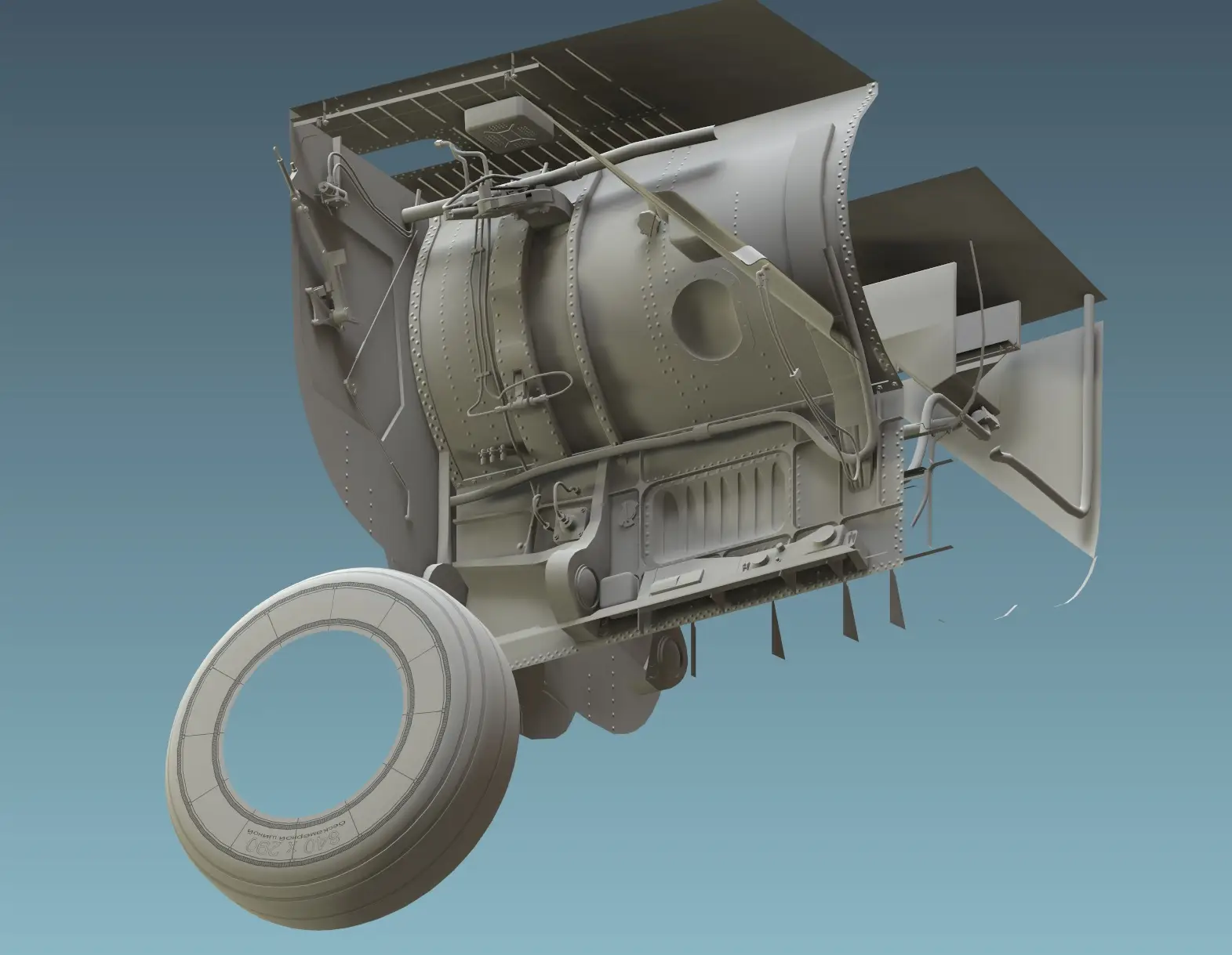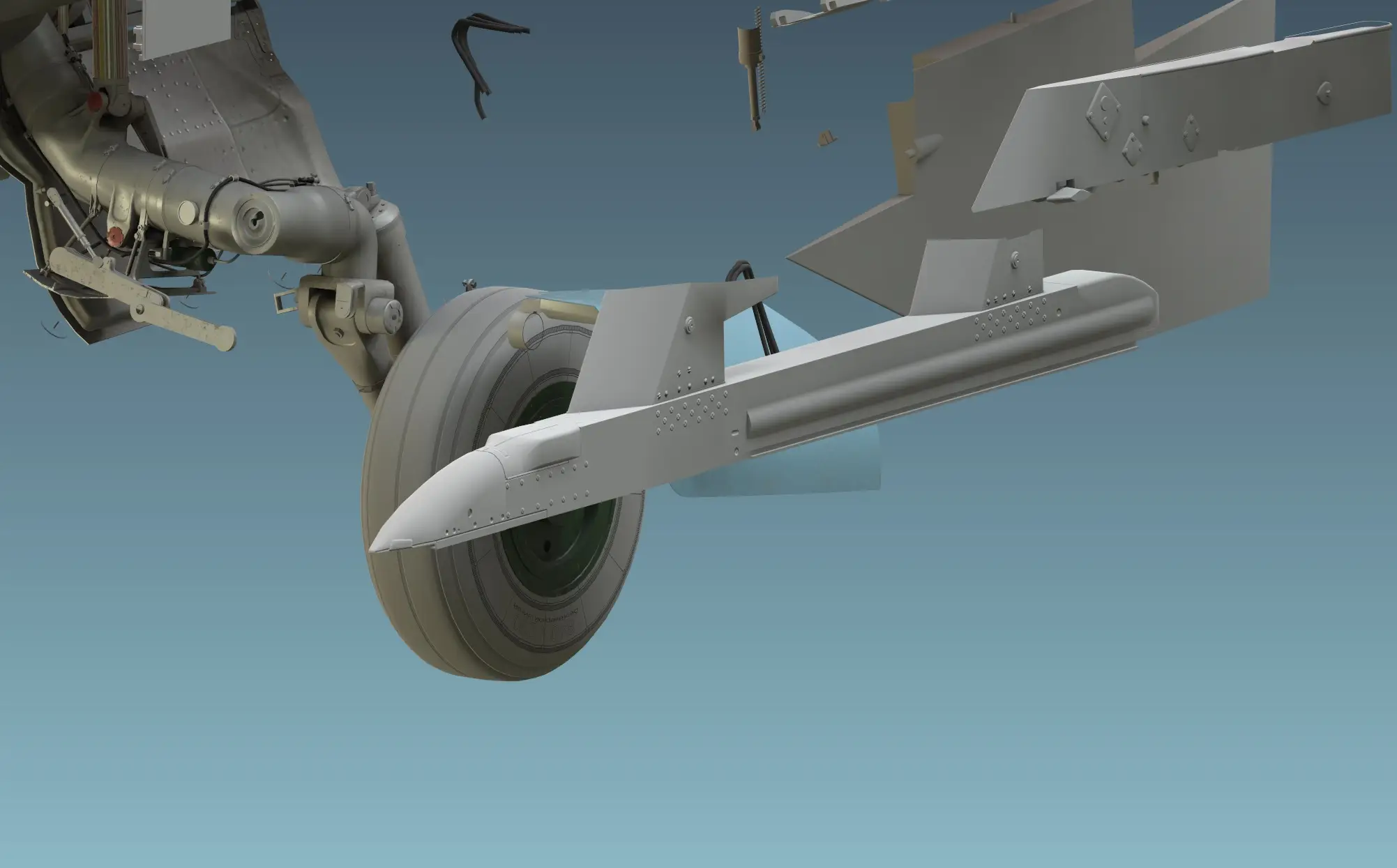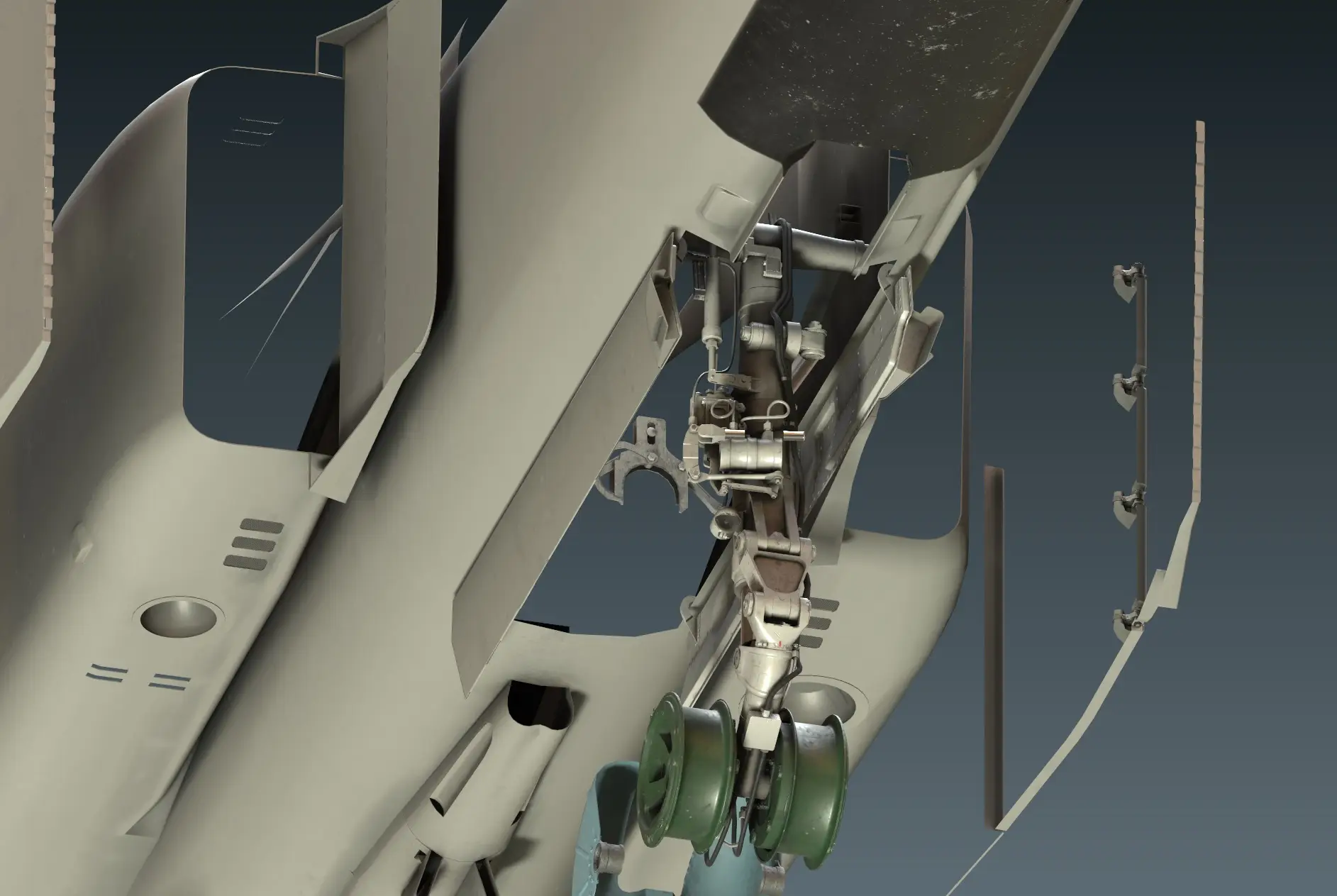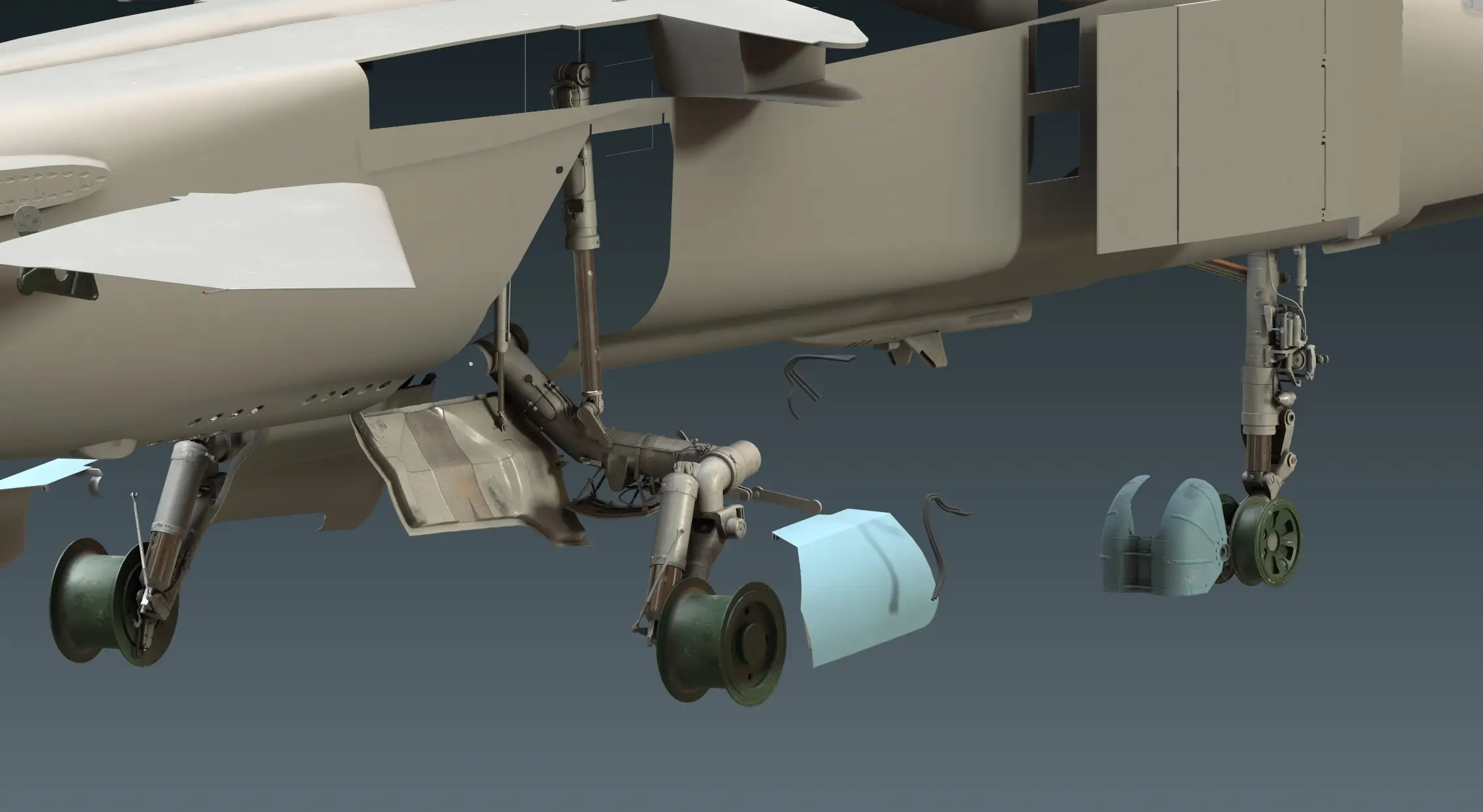 Nejnovější snímky se zaměřují na detaily ukazující složitý podvozek a motorové systémy MiGu-23.