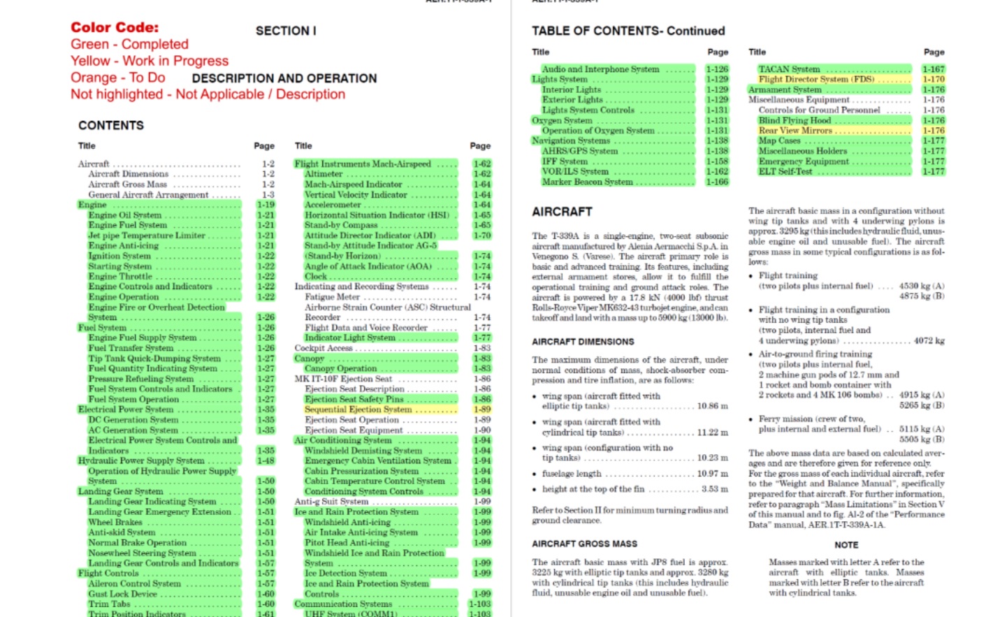 Nabízí se také kontrolní seznam založený na řadě systémů letadla. Položky označené na kontrolním seznamu zeleně jsou kompletní, zatímco hrstka položek je stále označena žlutě. Těmito položkami jsou sekvenční katapultovací systém, systém Flight Director System (FDS) a zpětná zrcátka.